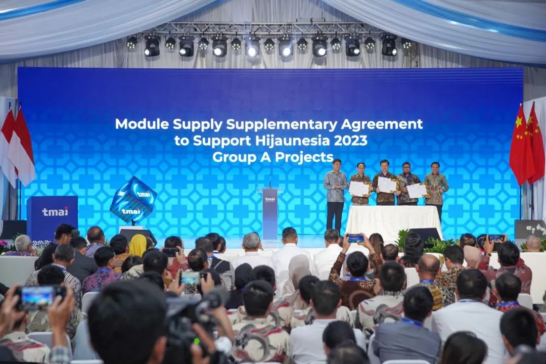 开幕仪式现场,天合光能印尼合资工厂TMAI与客户VENA、GCL就Hijaunesia Group A 等3个项目签订近400MW的组件供应协议。签约仪式既开启了天合光能印尼合资工厂TMAI正式启程的新篇章,也见证了当地市场对天合制造的绝对信任。