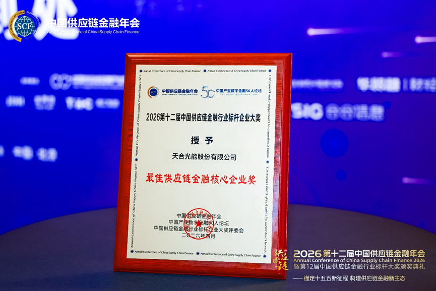 近日,2026第十二届中国供应链金融年会暨第十二届中国供应链金融行业标杆大奖颁奖典礼在北京隆重举行。中国银行原副行长,中国交易银行50人论坛主席张燕玲,国家金融监督管理总局政策研究局原一级巡视员叶燕斐、以及中国互联网金融协会业务一部副主任陈勇等重要嘉宾参会并发表重要讲话。天合光能股份有限公司(以下简称“天合光能”)凭借在供应链金融领域的卓越创新实践与产业链赋能成效,从近60家参评机构中脱颖而出,荣膺"最佳供应链金融核心企业奖"。