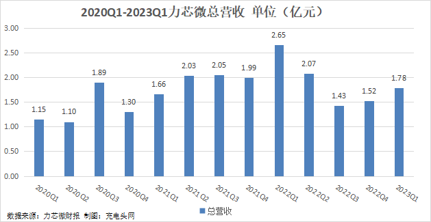 2020-2023年一季度力芯微公司分别实现总营收1.15亿元,1.66亿元,2.65亿元,1.78亿元;2021-2023年一季度总营收同比变动45.1%,59.32%,-32.64%。