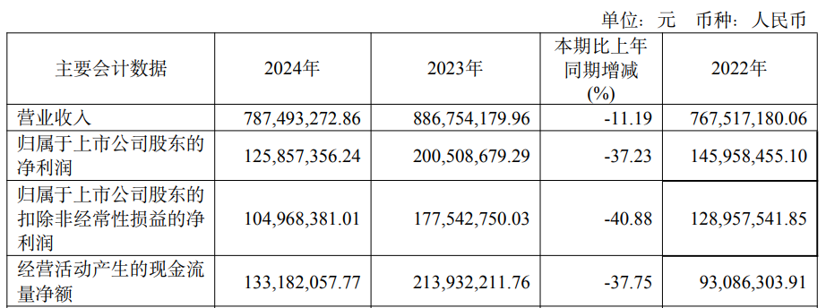 2024年,力芯微实现营业收入7.87亿元,同比下降11.19%;归属于上市公司股东的净利润1.26亿元,同比下降37.23%;归属于上市公司股东的扣除非经常性损益的净利润1.05亿元,同比下降40.88%;经营活动产生的现金流量净额为1.33亿元,同比下降37.75%。