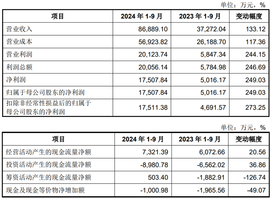 2024年1-9月,先锋精科实现营业收入86,889.10万元,同比增长133.12%;实现净利润/归属于母公司股东的净利润17,507.84万元,同比增长249.03%;实现扣除非经常性损益后的归属于母公司股东的净利润17,511.38万元,同比增长273.25%;经营活动产生的现金流量净额7,321.39万元,同比增长20.56%。