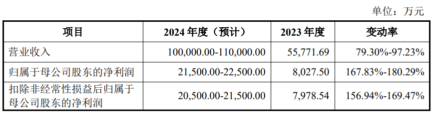 先锋精科2024年度预计实现营业收入100,000.00万元至110,000.00万元,同比增长79.30%至97.23%;预计实现归属于母公司股东的净利润为21,500.00万元至22,500.00万元,同比增长167.83%至180.29%;预计实现扣除非经常性损益后归属于母公司股东的净利润为20,500.00万元至21,500.00万元,同比增长156.94%至169.47%。