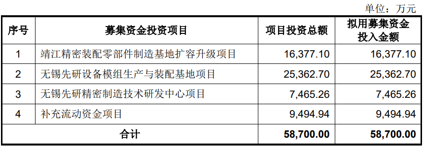 先锋精科本次公开发行募集资金总额为57,121.76万元,扣除发行费用后的募集资金净额为51,222.43万元,公司募集资金净额比原计划少7,477.57万元。先锋精科2024年12月6日披露的招股书显示,公司拟募集资金58,700.00万元,用于靖江精密装配零部件制造基地扩容升级项目、无锡先研设备模组生产与装配基地项目、无锡先研精密制造技术研发中心项目、补充流动资金项目。