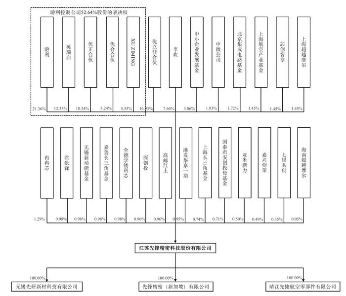 本次上市前,游利为先锋精科的控股股东、实际控制人,合计控制该公司52.64%的表决权。据招股书披露,游利直接持股21.36%,游利及其配偶褚潋持有英瑞启100%的股权。因此,游利通过英瑞启控制该公司12.35%股份的表决权。