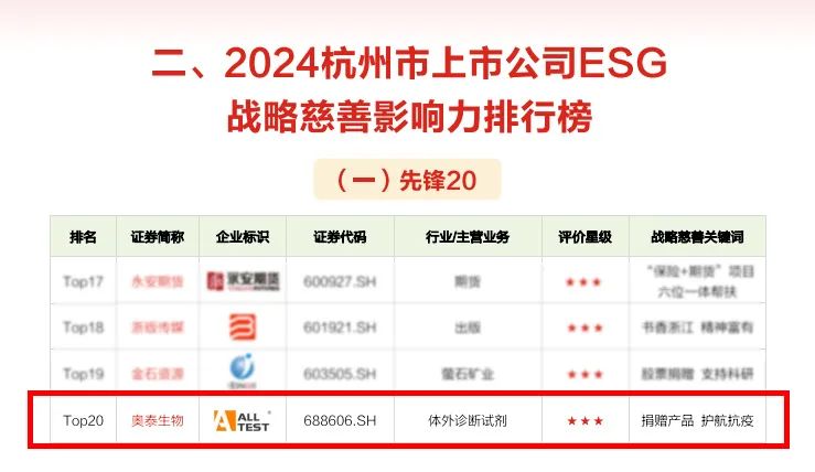 活动现场揭晓了“2024杭州市上市企业ESG战略慈善影响力先锋20”榜单。凭借高度的企业社会责任表现以及在践行社会公益领域所做的杰出贡献,奥泰生物在本次评选中脱颖而出,荣获【2024杭州市上市企业ESG战略慈善影响力先锋20】,展现了企业在ESG方面的优秀表现。ESG先锋企业奖旨在表彰经济效能与社会责任并重的先进企业,该奖项是对企业在Environmental(环境)、Social(社会)和Governance(治理)三方面工作的高度认可。