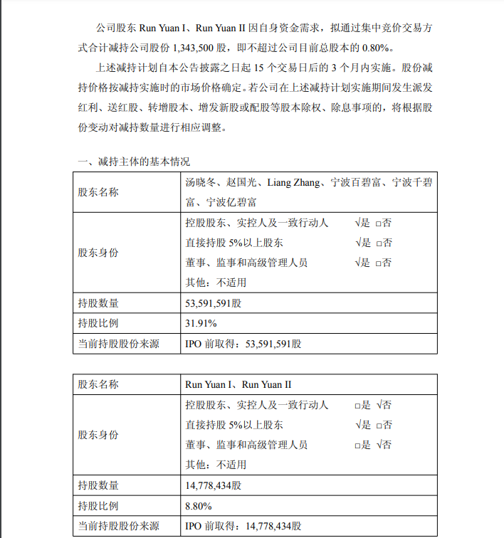 与此同时,恒玄科技持股5%以上的股东Run Yuan Capital I Limited(简称“Run Yuan I”)及其一致行动人Run Yuan Capital II Limited(简称“Run Yuan II”)亦因资金安排考虑,拟通过集中竞价方式合计减持不超过1,343,500股,占公司总股本的0.80%。