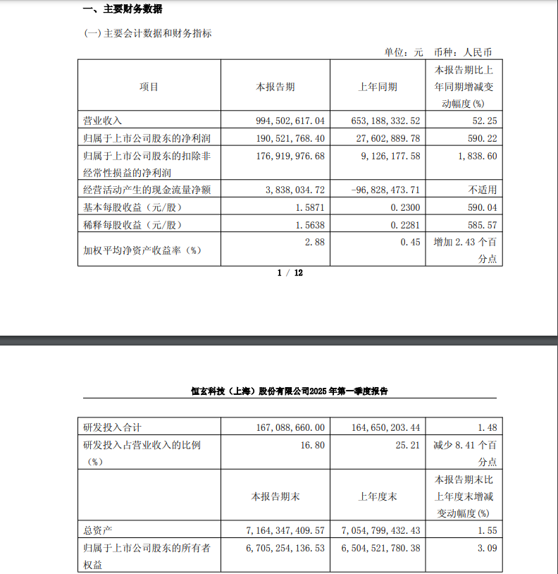 2025年一季度,恒玄科技实现营业收入 9.95 亿元,同比增加 52.25%,创单季度历史新高,实现归属于母公司的净利润 1.91 亿元,同比增长 590.22%,净利润也是成立以来的单季历史最高。
