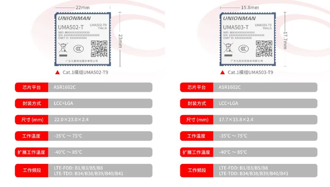 九联科技不断完善和丰富其Cat.1模组产品阵营,持续优化模组在功耗方面的表现,以满足用户对低功耗、高效率的需求。Cat.1模组UMA502-T9和UMA503-T9采用了国产芯片平台,具有低功耗、高性能、低成本的显著优势。采用了LCC+LGA主流封装方案,支持多种数据传输协议及3GPP标准AT指令、增强的AT扩展指令。具有良好的通用性和兼容性,帮助客户快速实现产品设计。