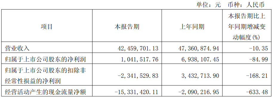 2025年第一季度,公司实现营业收入4245.97万元,同比下降10.35%;归属于上市公司股东的净利润为104.15万元,同比下降84.99%;归属于上市公司股东的扣非净利润为-234.15万元,上年同期为343.27万元;经营活动产生的现金流量净额为-1533.14万元,上年同期为-209.02万元。