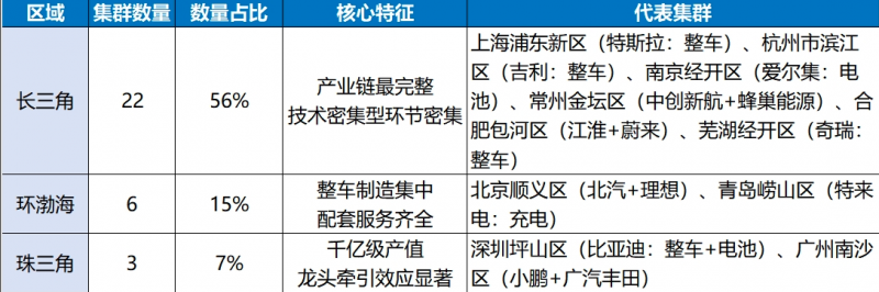 以新能源汽车产业为例,该产业具有产业链长、企业众多、政策导向性强等特点,是产业集群协同发展的典型代表。《全国产业集群大全》显示,全国共有39个新能源汽车产业集群,其中长三角地区以22个集群、占比56%的数量位居全国首位,形成了覆盖整车制造、关键零部件、智能网联等全产业链的协同发展格局。长三角的“密度优势”在于其产业链完整性,已构建起新能源汽车“4小时产业圈”,各地区发挥优势,共同推动产业高质量发展。环渤海、珠三角地区则分别以6个、3个集群位列全国第二、第三。