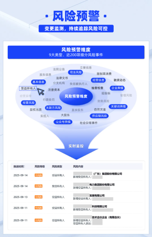 针对受益所有人信息动态变化的特点,启信慧眼「风险预警」模块可对企业9大类型、近200项风险事件开展全天候监控。金融机构可将“受益所有人变更”设为高风险事件,通过实时预警分层推送模式,第一时间获取变更信号。例如,某企业因受益所有人频繁轮换触发预警,系统监测到新增与退出人员信息后立即发出通知。经查验,该企业近三个月内多次反复轮换受益所有人,存在公司治理不稳定及潜在的洗钱、欺诈风险。金融机构据此展开独立核查,要求企业针对变更原因及控制权稳定性作出书面解释,并评估新增受益所有人身份,进一步强化反洗钱筛查,有效防控了潜在风险。