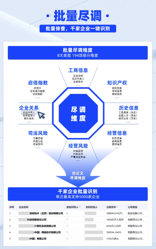 基于海量商业大数据与AI技术,启信慧眼可深度挖掘企业关联信息,实现受益所有人自动穿透识别。系统在「企业详情页」中全面展示符合条件的受益所有人清单,并提供任职类型、持股比例、持股路径及判定依据等关键信息,同时自动对应新规三大识别标准输出结果。这一功能大幅减少了人工搜集信息、梳理路径的工作量,降低了主观误判风险,有效规避了遗漏与错报问题。尤其在《受益所有人信息管理办法》实施后,金融机构需对存量客户重新判定受益所有人信息,涉及大量客户的更新与识别工作。若依赖人工处理,不仅效率低下,还易出现错漏。启信慧眼「批量尽调」功能支持单次最高5000家企业的一键排查,涵盖工商、司法、经营等194项细分维度,将数周的排查工作缩短至几分钟,显著提升了金融机构对大规模客户的处理效率。