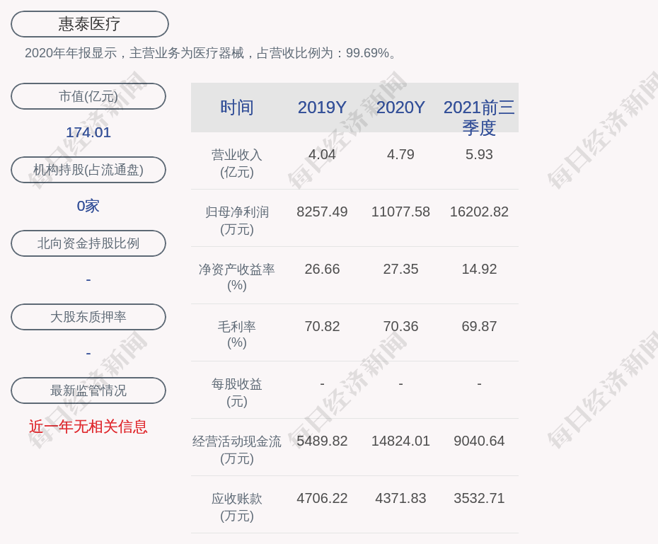 2020年年报显示,惠泰医疗的主营业务为医疗器械,占营收比例为:99.69%。