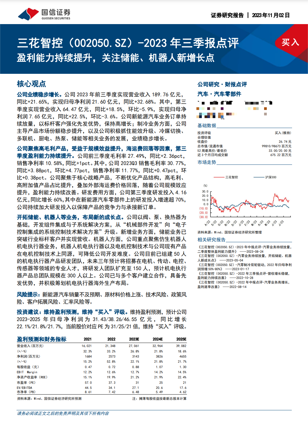 答:宏观来看,在双碳目标及需求的影响下,新能源汽车渗透率持续增长,是未来高确定性的趋势。汽车零部件行业来看,汽车热管理向集成化方向发展,主要体现为各种零部件和多功能模块的集成。公司层面来看,①三花利用标杆客户示范效应强化先发优势,加速构建与客户的配套体系,丰富产品谱系,加深行业技术壁垒,能保持引领行业发展的技术水平;②规模化生产使产品具备成本竞争优势;③在全球化开拓中,积极推进墨西哥、波兰及国内绍兴滨海、中山、沈阳等生产基地的建设,加大产能布局和人才队伍的建设,致力于在全球汽车电动化和智能化的浪潮中高速增长;④公司积极与现有客户和潜在客户谈判,拓展客户序列和单客户采购量,抓住“开源”机会。