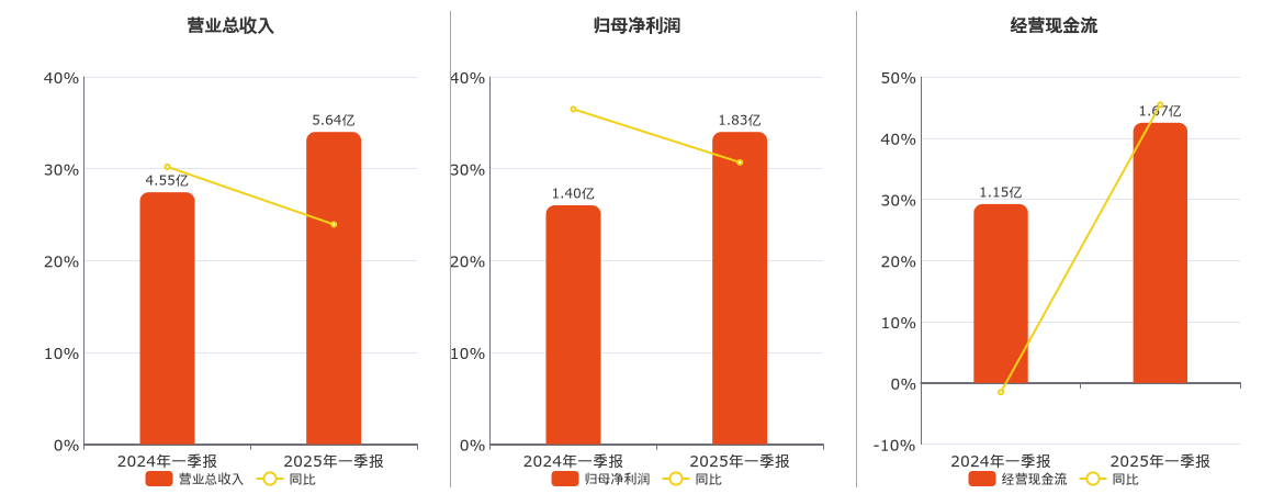 公司营业总收入为5.64亿元。归母净利润为1.83亿元。经营活动现金净流入为1.67亿元。