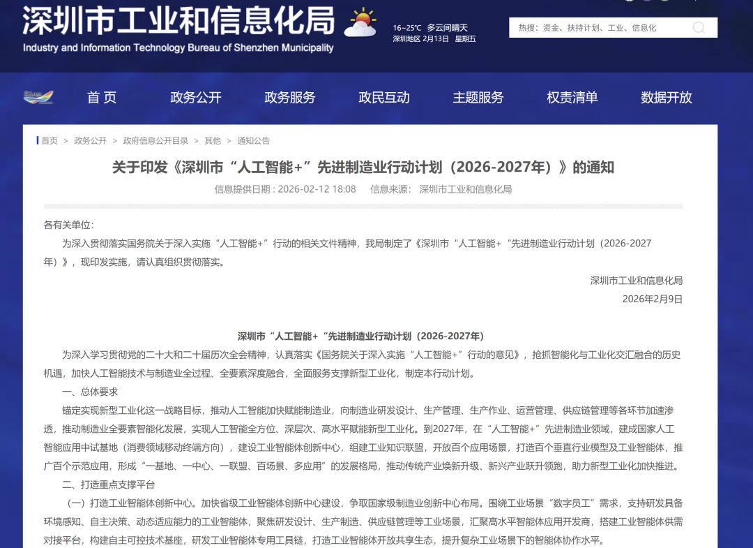 2026年开年,深圳正式印发《深圳市“人工智能+”先进制造业行动计划(2026-2027年)》,以“一基地、一中心、一联盟、百场景、多应用”为核心框架,擘画人工智能与制造业深度融合的先行示范路径。