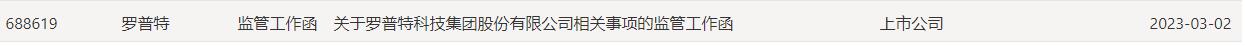 3月2日,上交所发布关于罗普特科技集团股份有限公司(简称“罗普特,688619.SH”)相关事项的监管工作函。