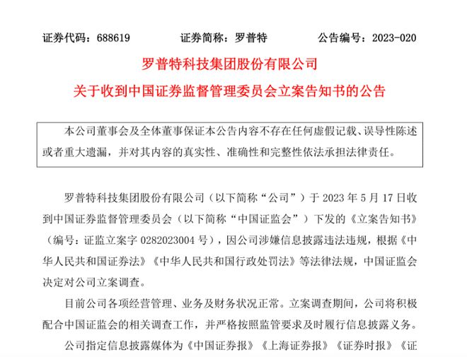 针对此次立案调查,罗普特还在公告中称,目前经营管理、业务及财务状况正常。立案调查期间,将积极配合证监会的调查,并严格按照监管要求及时履行信息披露义务。