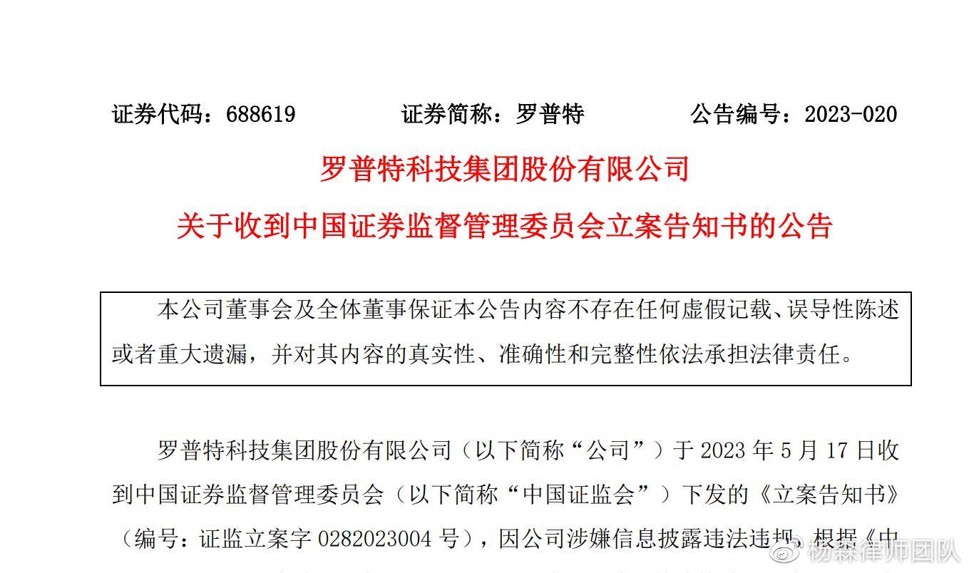 2023年5月18日,罗普特科技集团股份有限公司(简称公司或者罗普特)公告称,收到中国证监会的立案告知书。