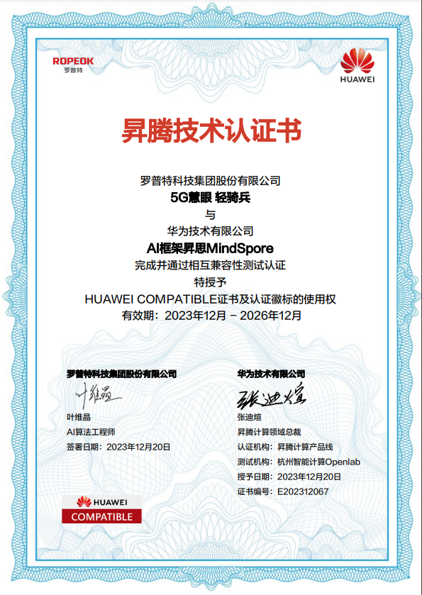 近日,罗普特自主研发的“5G慧眼轻骑兵”AI产品与华为技术AI框架昇思MindSpore完成并顺利通过兼容性测试认证,正式获得HUAWEI COMPATIBLE证书及认证徽标的使用权。