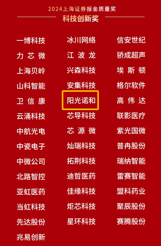 近日,备受瞩目的2024上海证券报“金质量”奖评选结果正式揭晓,北京阳光诺和药物研究股份有限公司(以下简称“阳光诺和”)董事长利虔先生凭借卓越的领导力和公司在资本市场中的优异表现,荣获“卓越企业家奖”!阳光诺和凭借在生物医药领域的科技创新脱颖而出,荣获科技创新奖!