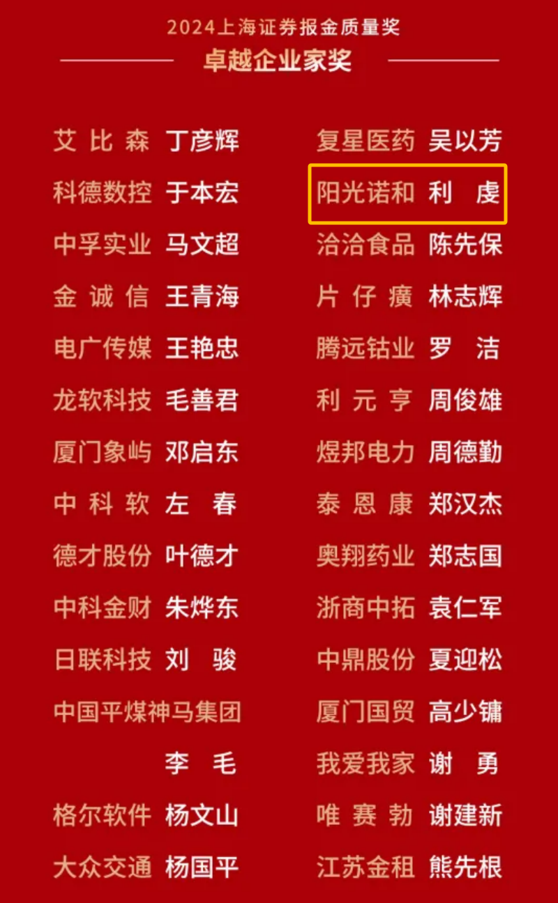 作为国内上市公司领域最权威、最具影响力的奖项之一,“金质量”奖聚焦公司治理完备、成长性佳、具备科创力和社会影响力等多个维度,旨在表彰在资本市场中表现卓越的企业及其管理者,已成为国内上市公司领域内最权威、最具影响力的奖项之一。阳光诺和能够在众多优秀企业中脱颖而出,离不开利虔先生的卓越领导力和公司的持续创新与发展。