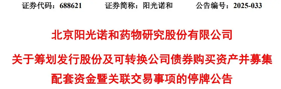 阳光诺和(688621)4月24日晚间公告,拟通过发行股份及可转换公司债券方式购买江苏朗研生命科技控股有限公司(以下简称“朗研生命”)100%股权,并向不超过35名特定投资者发行股份募集配套资金。公司股票自2025年4月25日开市起开始停牌,预计停牌时间不超过5个交易日。