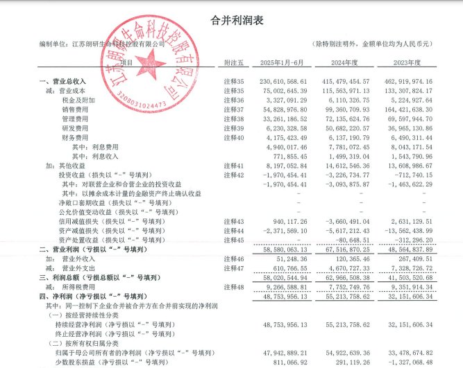 审计报告显示,2023年和2024年及2025年上半年,朗研生命的净利润分别为3348万元、5492万元、4794万元。按照2024年净利润计算,本次交易PE为21.81倍。
