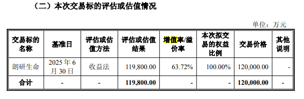 不过,本次交易价格是有溢价的。经收益法评估,朗研生命评估基准日股东全部权益评估值为11.98亿元,比审计后合并报表归属于母公司所有者权益增值4.66亿元,增值率63.72%。
