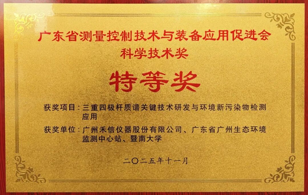 近日,由广州 禾信仪器 股份有限公司牵头,联合广东省广州生态环境监测中心站、 暨南大学 共同完成的《三重四极杆质谱关键技术研发与环境新污染物检测应用》项目,荣获2025年度 广东省测量控制技术与装备应用促进会 “技术创新奖”特等奖!