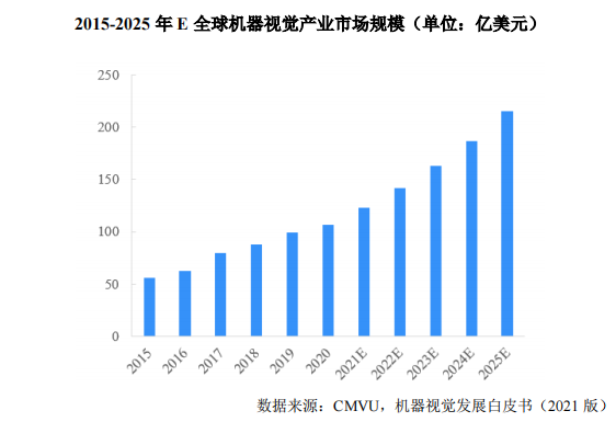 根据《机器视觉发展白皮书(2021版)》的数据,2020年全球机器视觉市场规模已达到107亿美元。未来随着工业自动化的应用领域不断拓展和工业生产过程中对于检测精细度的要求不断提升,工业自动化产业对于自动检测设备的需求持续增长,预计2025年全球机器视觉产业市场规模预计将达到215亿美元。