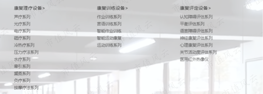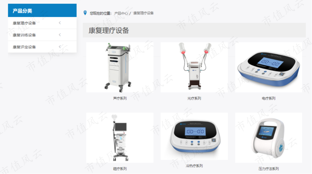 主要产品包括康复评定设备、康复训练设备以及康复理疗设备。