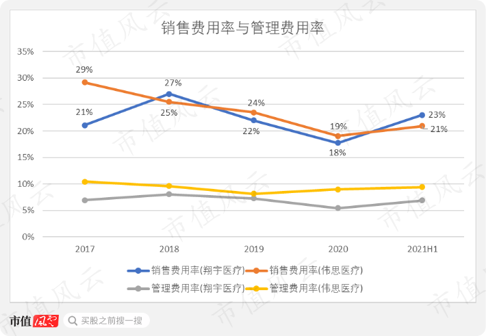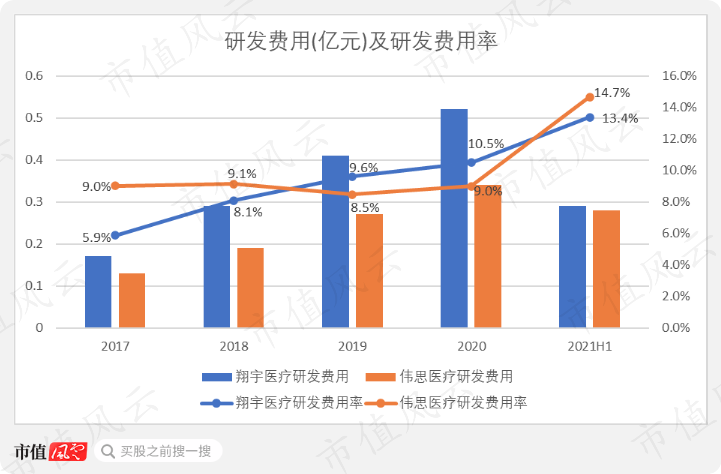 从费用率角度来看,翔宇医疗与伟思医疗的销售费用率不相上下,且其管理费用率一直低于伟思医疗。