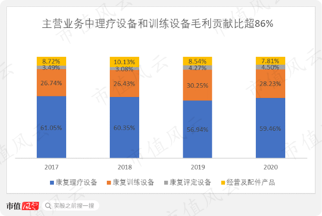 从毛利来看,公司毛利主要由康复训练设备和康复理疗设备贡献,2017-2020年,康复训练设备和康复理疗设备毛利占比超过了主营业务收入的86%。