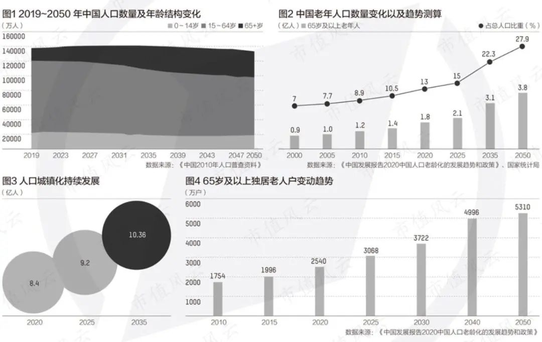 2020-2050年,中国人口老龄化加速,2050年65岁及以上老年人口将近4亿。