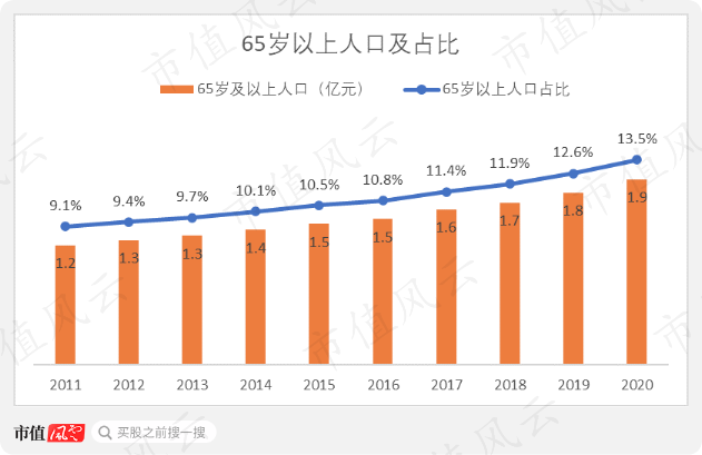 养老行业中,我国老龄化程度进一步加深。2020年65岁及以上人口为1.9亿,占比13.5%,而60岁及以上人口占比高达18.7%。