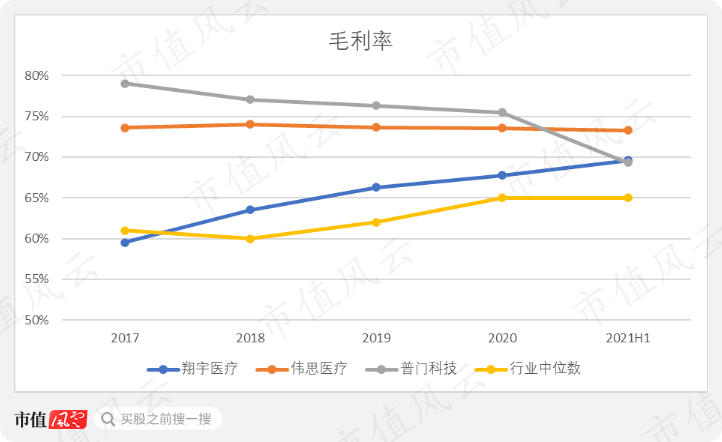 2017-2020年,翔宇医疗毛利率从60%一路增长至68%,与伟思医疗和普门科技的毛利率差距不断缩小。