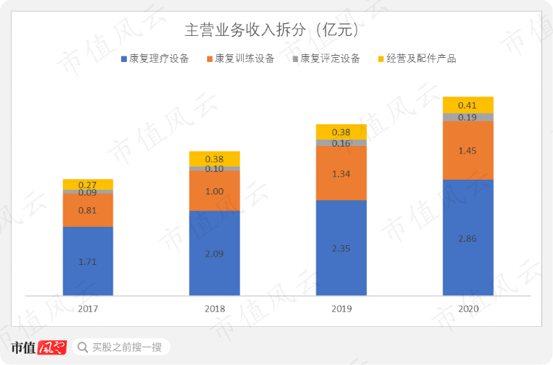其中康复理疗设备是公司收入的主要来源,2020年该项营收2.86亿,占营业收入的57.7%。