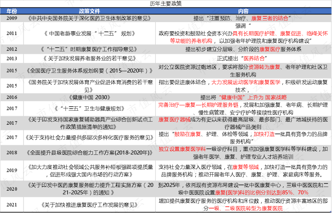 2009年-2021年,有关康复医疗的各项政策陆续出台。2020年提出,到2025年,三级和二级中医医院的康复科比例要分别达到85%和70%。