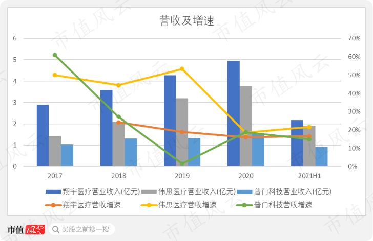 与同行的伟思医疗(688580.SH)以及普门科技(治疗与康复类业务)相比而言,翔宇医疗处于规模领先地位,但在营收增速方面处于中间位置,低于伟思医疗。