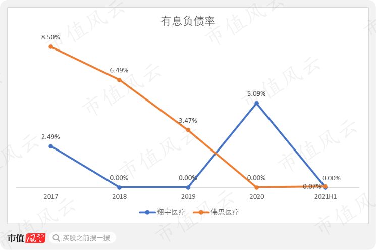 来看下公司的有息负债率的横向对比,翔宇医疗从2017年至2021年中期,有三次有息负债率为0,也就是说公司账上没有需要支付的利息的欠款。