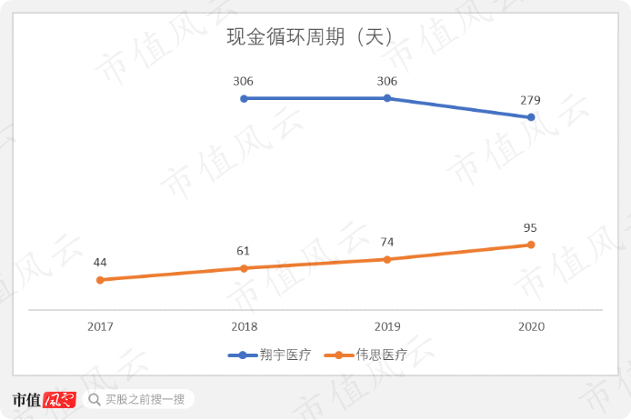 对比同期的伟思医疗,虽然从2017-2020年整体呈现上升趋势,但还远远低于翔宇医疗的现金循环天数。