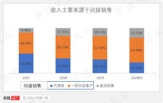 风云君发现间接销售占主营业务收入比例超过78%,但直接销售似乎从2018年起有逆势增长的趋势,这与公司新的分期收款销售模式有关,留待后文具体讲述。