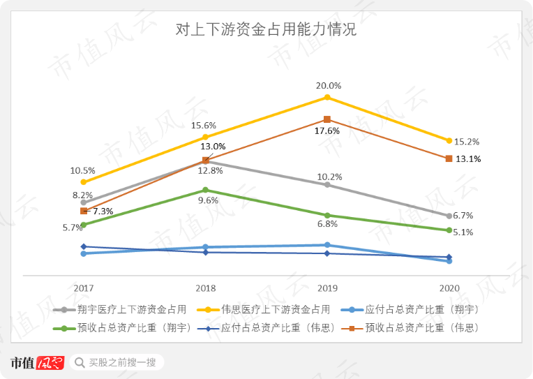 进一步拆分来看,剔除2020年伟思医疗上市对总资产的影响,伟思医疗预收占总资产比重远大于翔宇医疗,一定程度上表明伟思医疗对下游掌控能力较强。