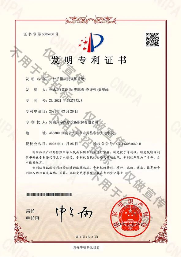 经国家专利局严格审查、专家评审、相关部门联审等程序后,翔宇医疗的《一种手指康复训练系统》成功荣获国家专利局颁发的发明专利证书!