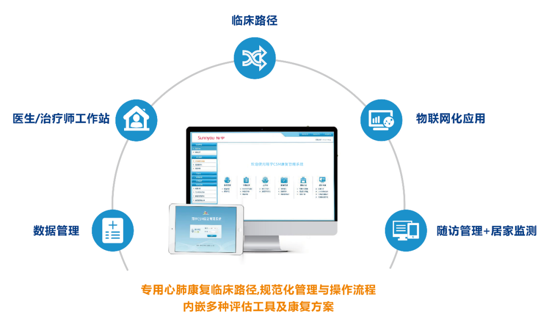 数字化心肺康复解决方案服务体系:实现了以病人为核心的心肺康复临床路径,并可多学科共享数据库,对临床心肺康复落地有良好的实用性和指导意义,可实现三期心肺康复(医院、社区、居家)无缝对接。