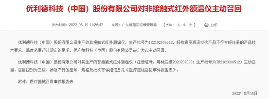 优利德科技(中国)股份有限公司(简称“优利德”,688628.SH)生产的非接触式红外额温仪,生产批号为IR2102006512,经检查发现该批次产品不符合经注册的产品技术要求,温度范围超过规定的要求,优利德科技(中国)股份有限公司决定发起主动召回。优利德科技(中国)股份有限公司对其生产的非接触式红外额温仪(注册证号:粤械注准20202070831 生产批号为IR2102006512)主动召回。召回级别为三级。
