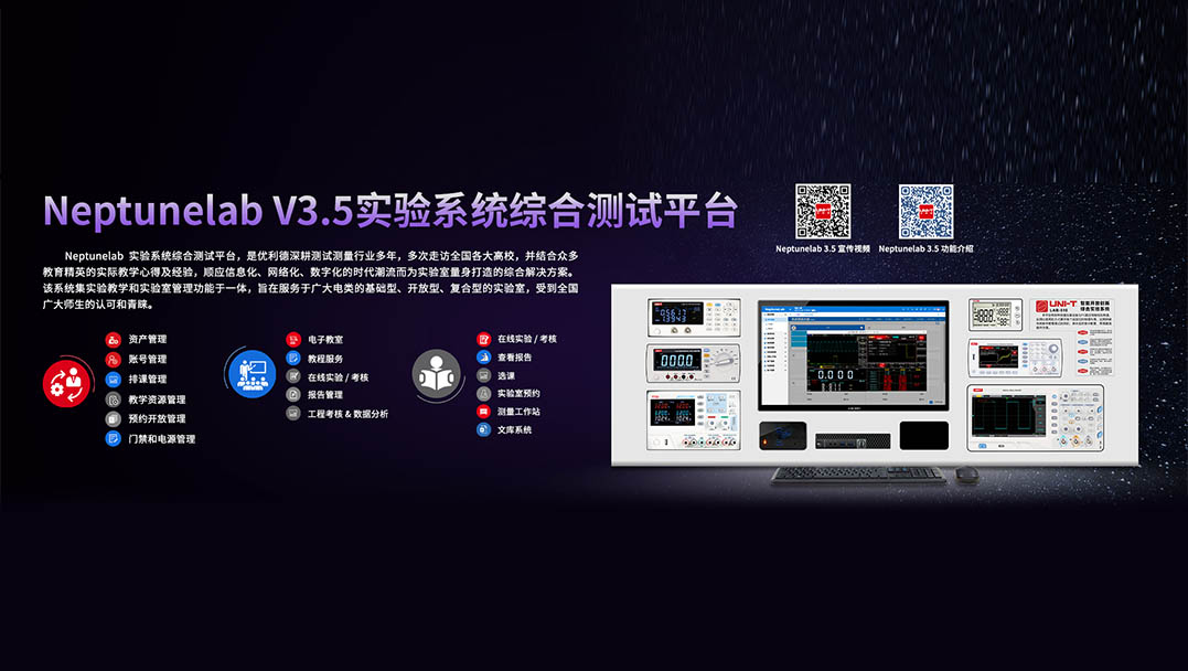 NeptuneLab V3.5实验系统综合测试平台和SaturnLab PES-1000A/3000A电力电子模型开发与实训系统是优利德服务高等教育的两套核心解决方案。NeptuneLab V3.5配套了数字示波器、函数/任意波形发生器、可编程直流稳压电源、数字万用表、数字交流毫伏表等可以满足实验室各种测试需求的测试测量仪器仪表。系统形成了实验室管理、老师教学、学生学习三个方向的分层次、多模块、相互衔接的实践教学体系,以虚实结合、以虚控实的实践教学模式,为学生提供了一个数字化、开放性、个体化的学习环境。