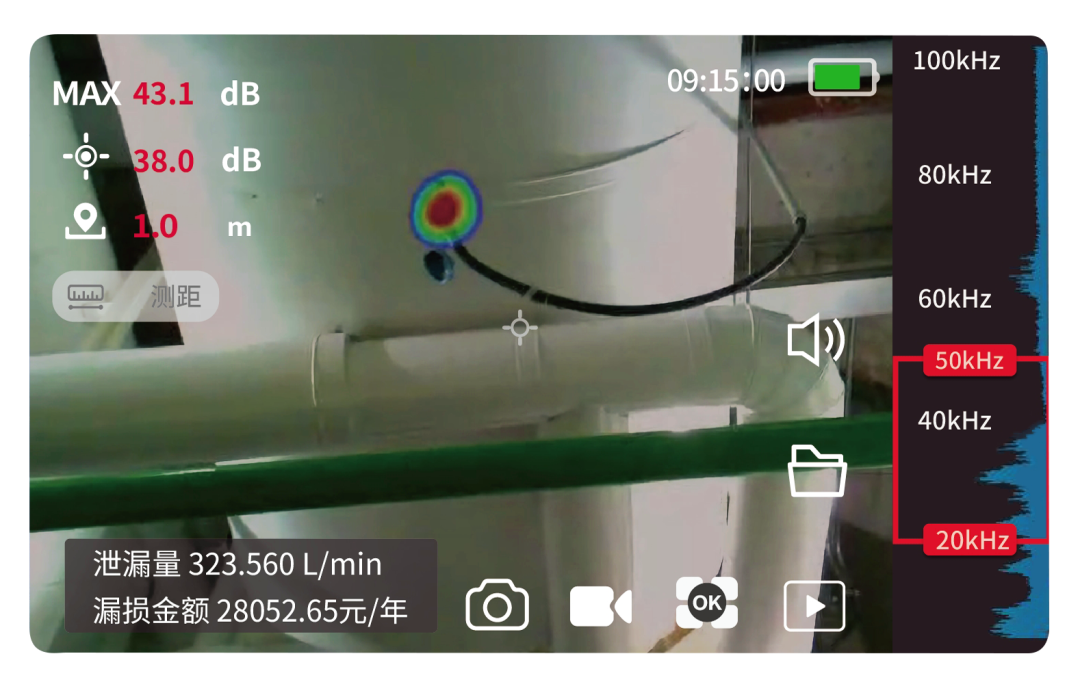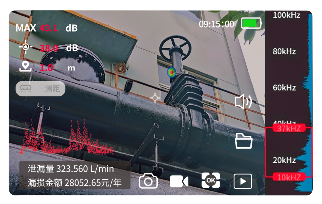 可视化报告输出:产品支持热力图与声学图像融合显示,可快速生成检测报告,清晰标注异常声源位置、泄漏量与泄漏损失。这些数据为设备状态评估、预防性维护和智能巡检体系构建提供了有力支撑。
