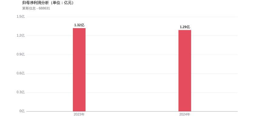莱斯信息上市的2023年,当年实现归母净利润1.32亿元,截至最新完整财年的2024年,公司实现1.29亿元的归母净利润,累计利润增长了-2.31%。这2个年间,莱斯信息无一年份出现亏损,归母净利润增长的年份达到1年,占比高达50.0%。从最近年份的财报看出,公司盈利能力保持相对稳定。